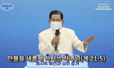 今日新天地イエス教会は永生を叫び、聖書の御言葉を地球村のすべての人々に伝えています。10月18日から月・木午前10時に全世界で最初に啓示録セミナーを行っています。そのセミナーは「神様の新しい契約黙示録(啓示録)の預言と成就の証し」の題目でユーチューブで生放送されています。