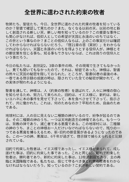 新約の約束の牧師についてはヨハネの啓示録(黙示録)に詳し説明しています。